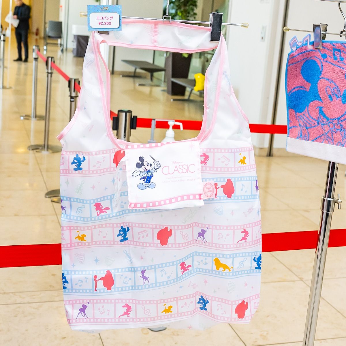 プログラムの作品に登場するキャラクターと、「ミッキーマウス」のシルエットがデザインされたエコバッグ。