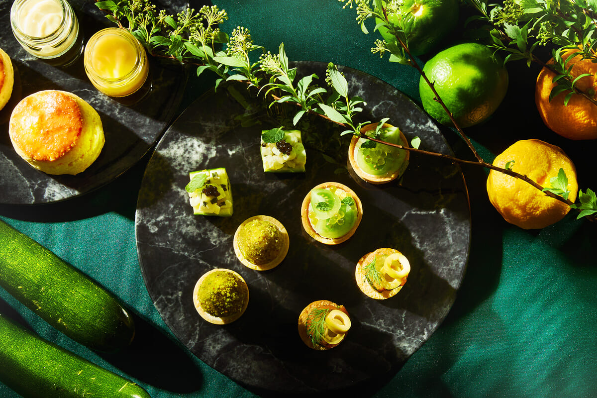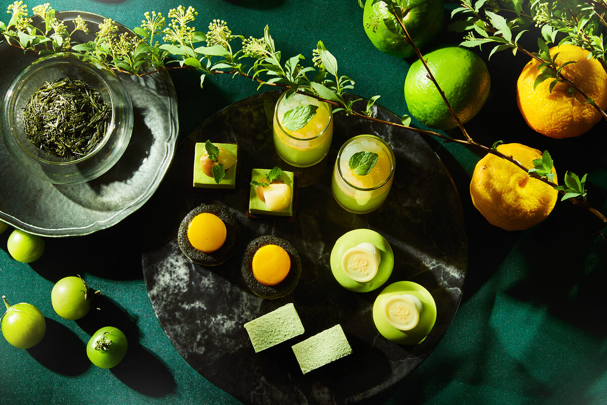 グリーンカラーを纏った見た目も涼やかなスイーツ&セイヴォリーと、「SAYURI」の洗練された新感覚のお茶のティーペアリング。