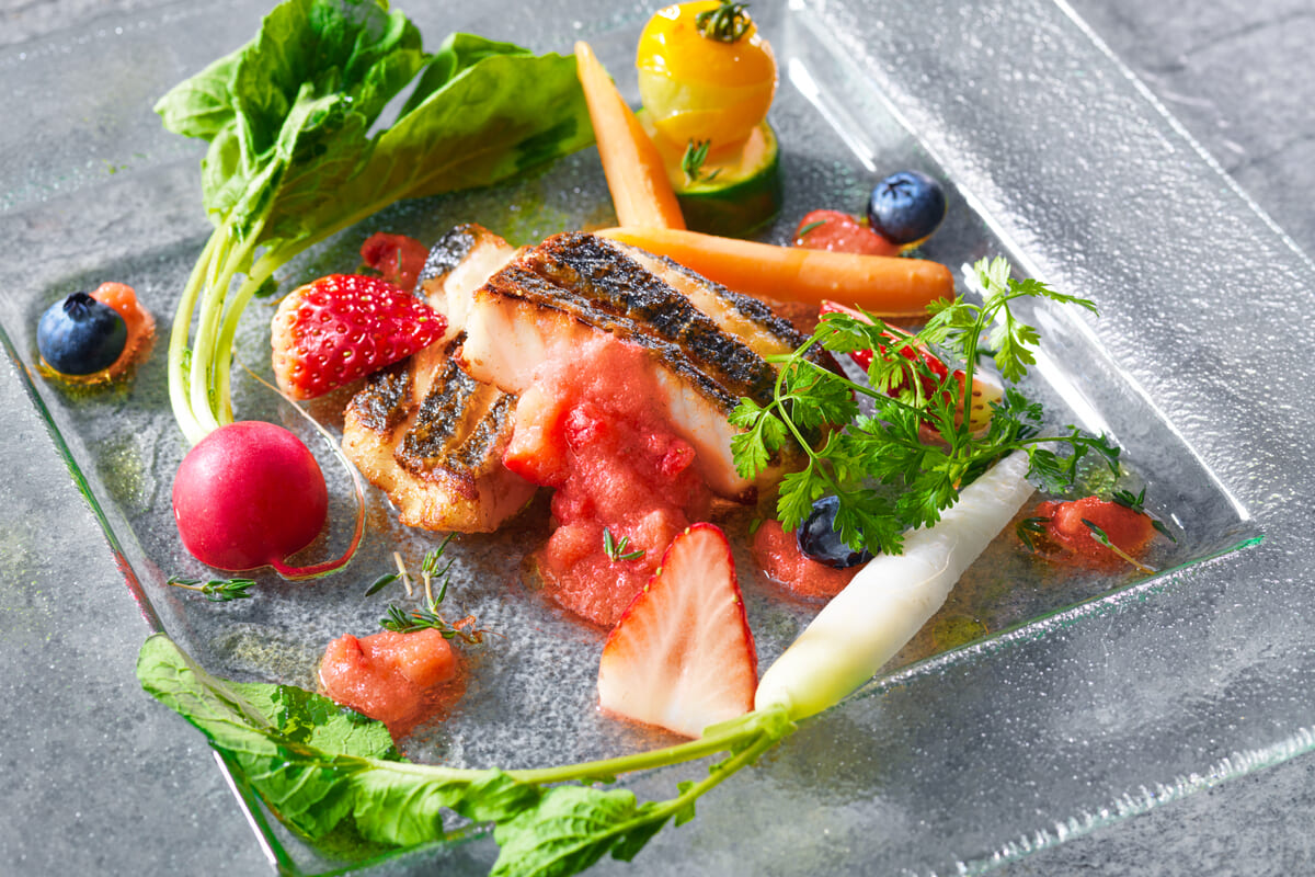 「北海道産サクラマスのポワレ ストロベリーソース」はやわからな桜鱒に、いちごとオニオンをペースト状にした爽やかなソースが添えられています。