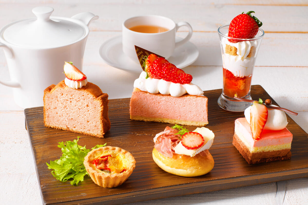 いちごをテーマに、スイーツ4種とセイボリー (軽食) 2種を添えたアフターヌーンティー。