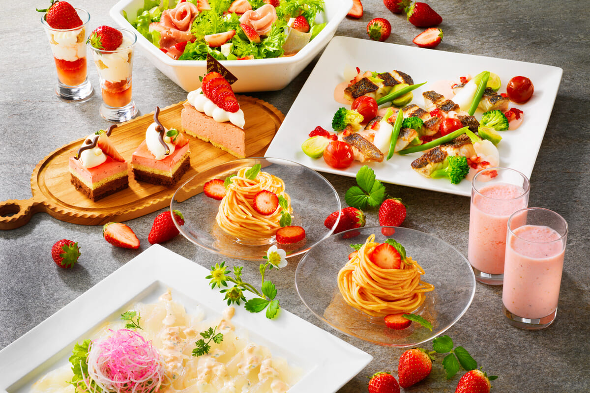 いちごを使った、春らしい爽やかな食事を楽しめるディナーブッフェ。