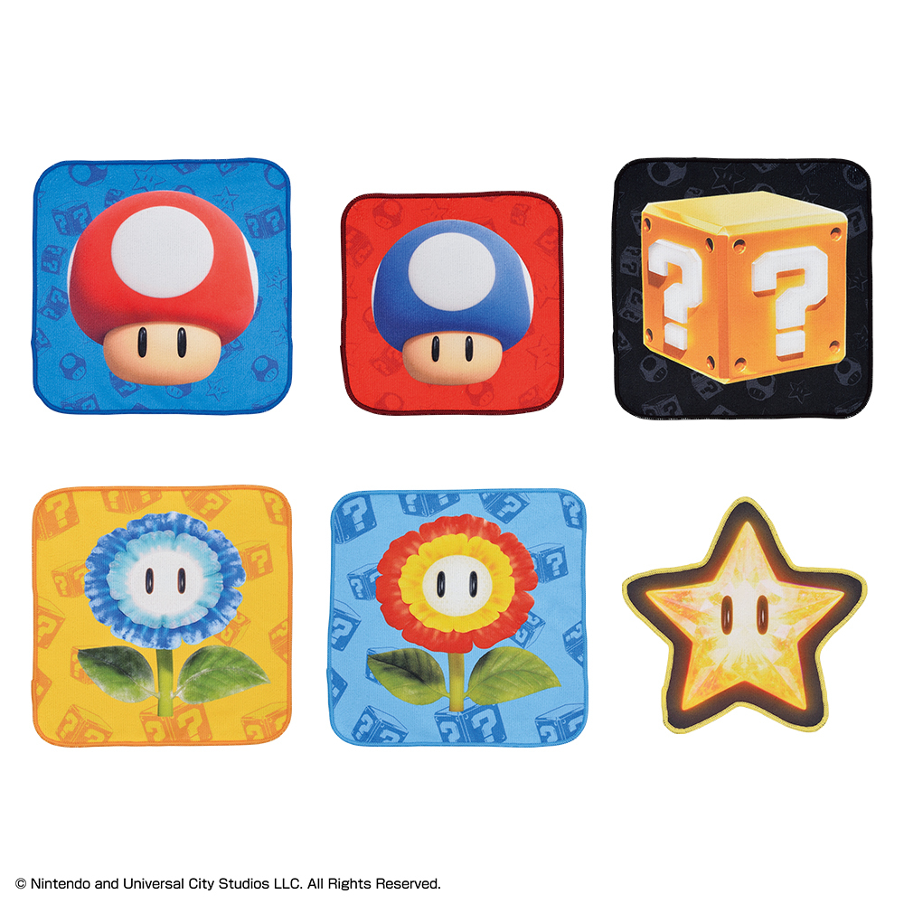 映画『ザ・スーパーマリオブラザーズ・ムービー』に登場するアイテムがデザインされたミニタオル。