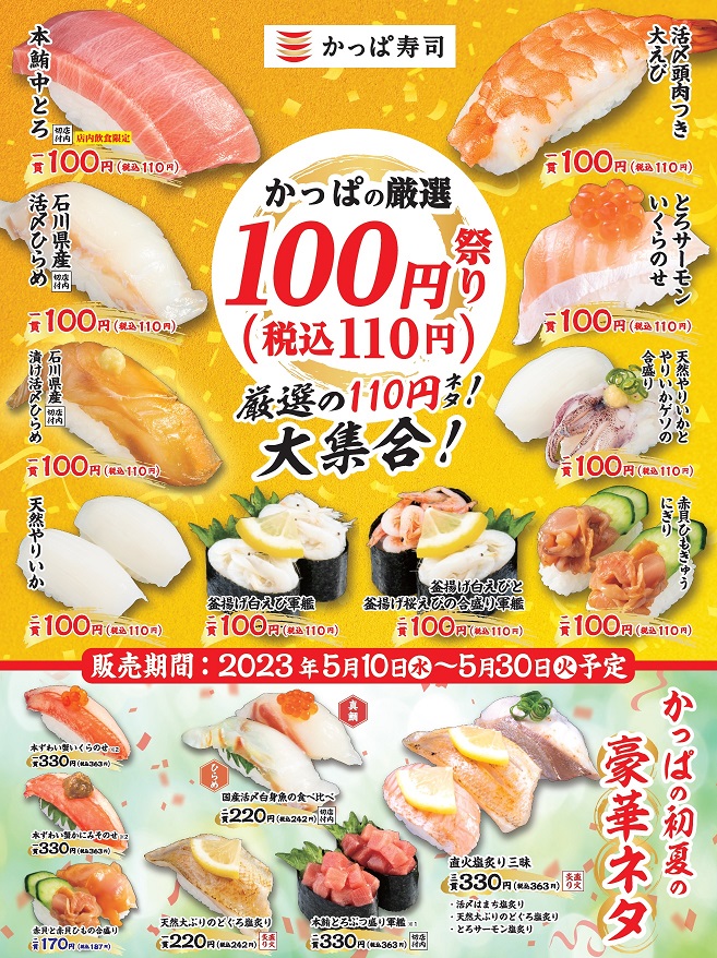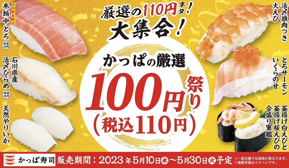 そんなかっぱ寿司が、2023年5月10日~5月30日の期間で「かっぱの厳選 100円(税込 110円)祭り」を開催。