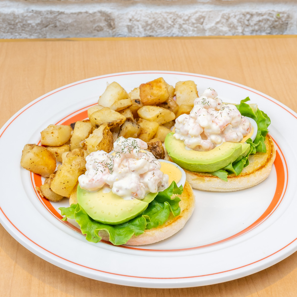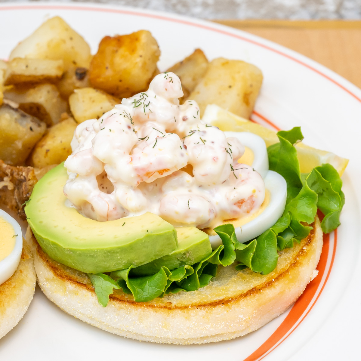 ヨーロッパでよく食べられているイングリッシュマフィンにのせたオープンサンドの「小エビとアボカドのタルティーヌ」