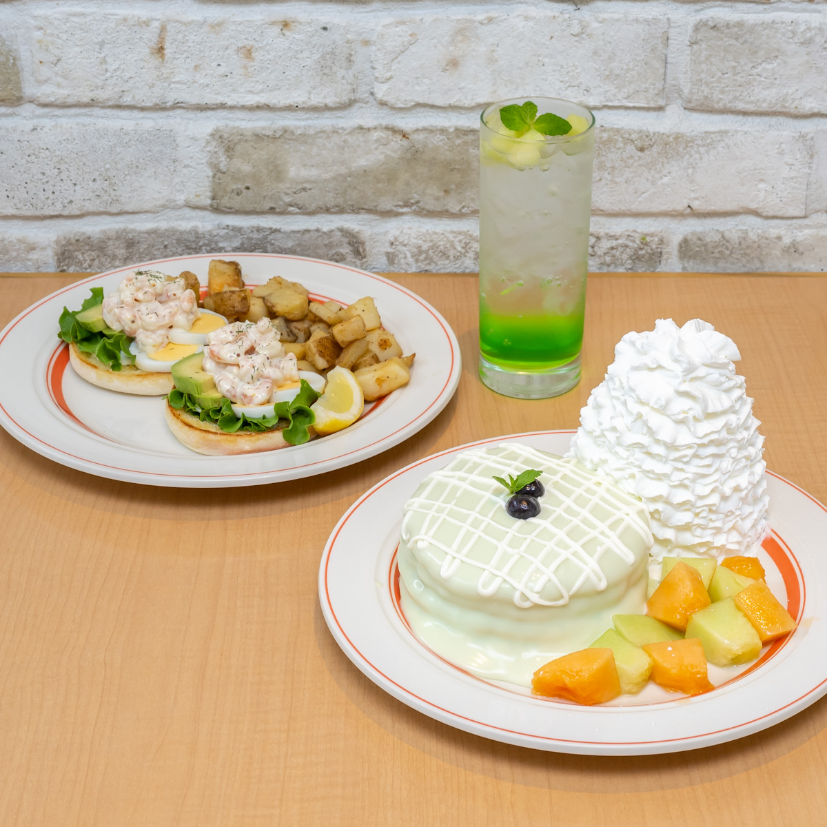 Eggs ’n Things「メロン de パンケーキ」「小エビとアボカドのタルティーヌ」