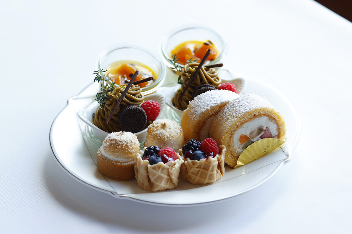 アフタヌーンティースタンド上段は、画像奥から時計回りに、「ベイクドレアチーズ アプリコットとパッションフルーツソース」、「ピスタチオのモンブラン」、「ミニフルーツロール」、「バスケットルージュ」、「ライムとココナッツのミニタルト」。