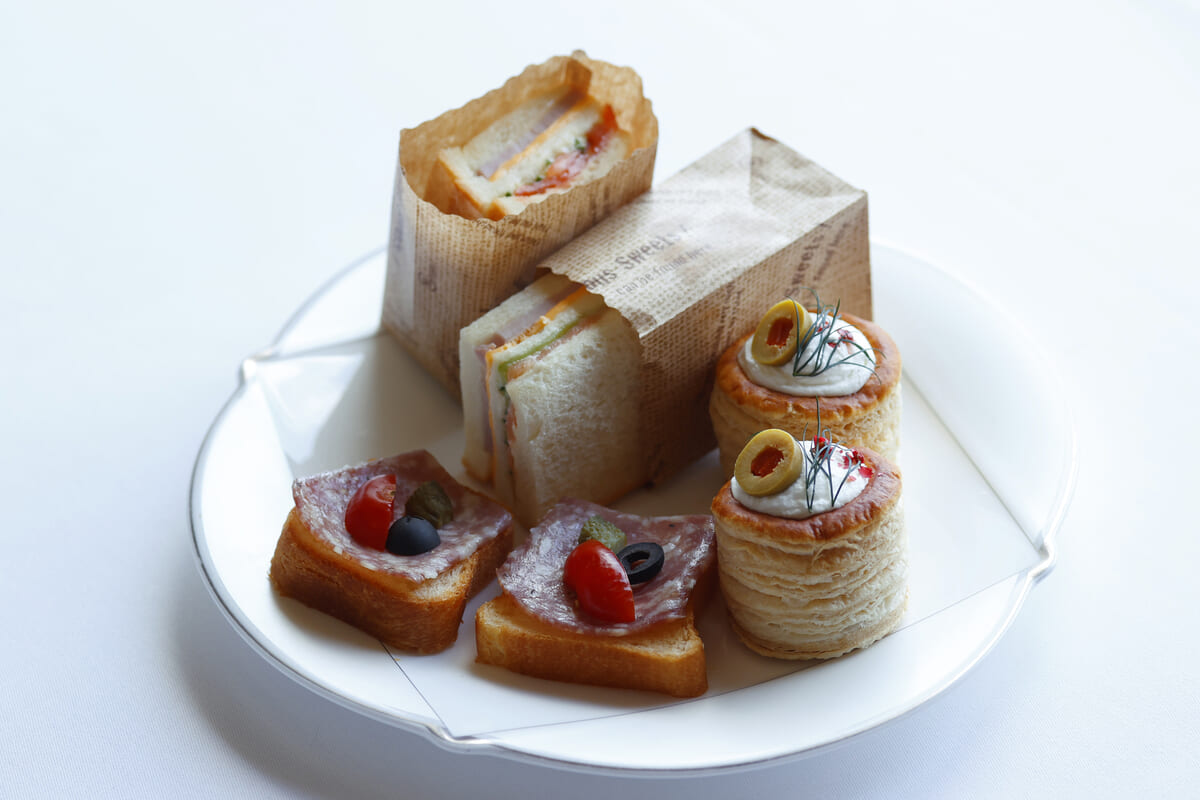 下段には、「サワークリームとツナのボローヴァン」、「オープンサンド」、「ハムとチーズのサンドウィッチ」、「サーモンときゅうりのサンドウィッチ」の軽食が並びます。