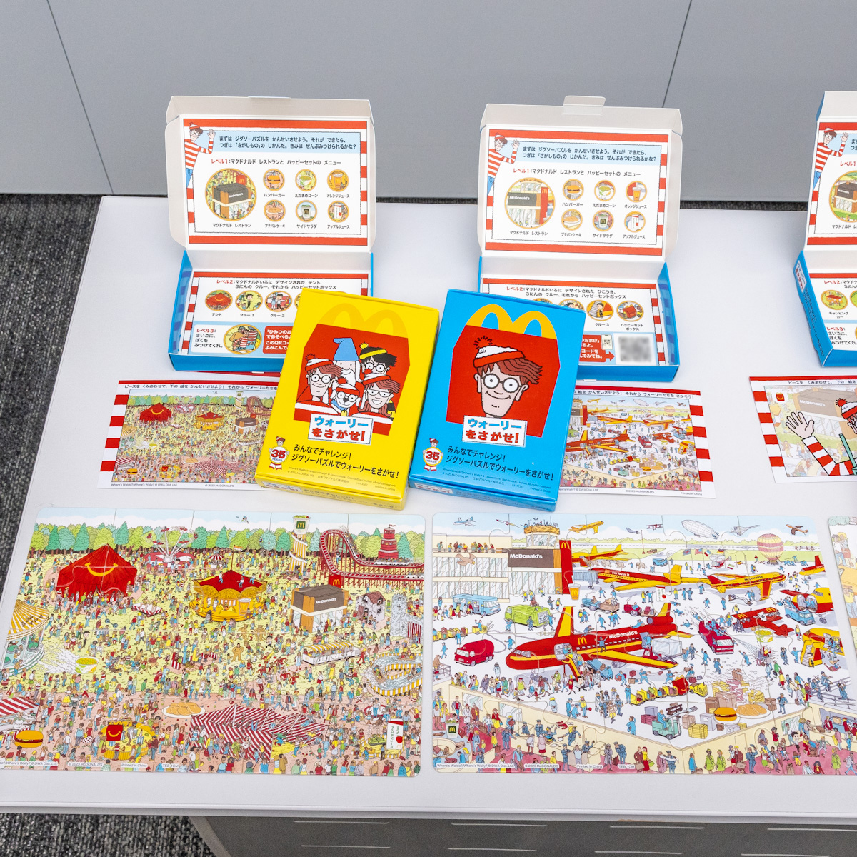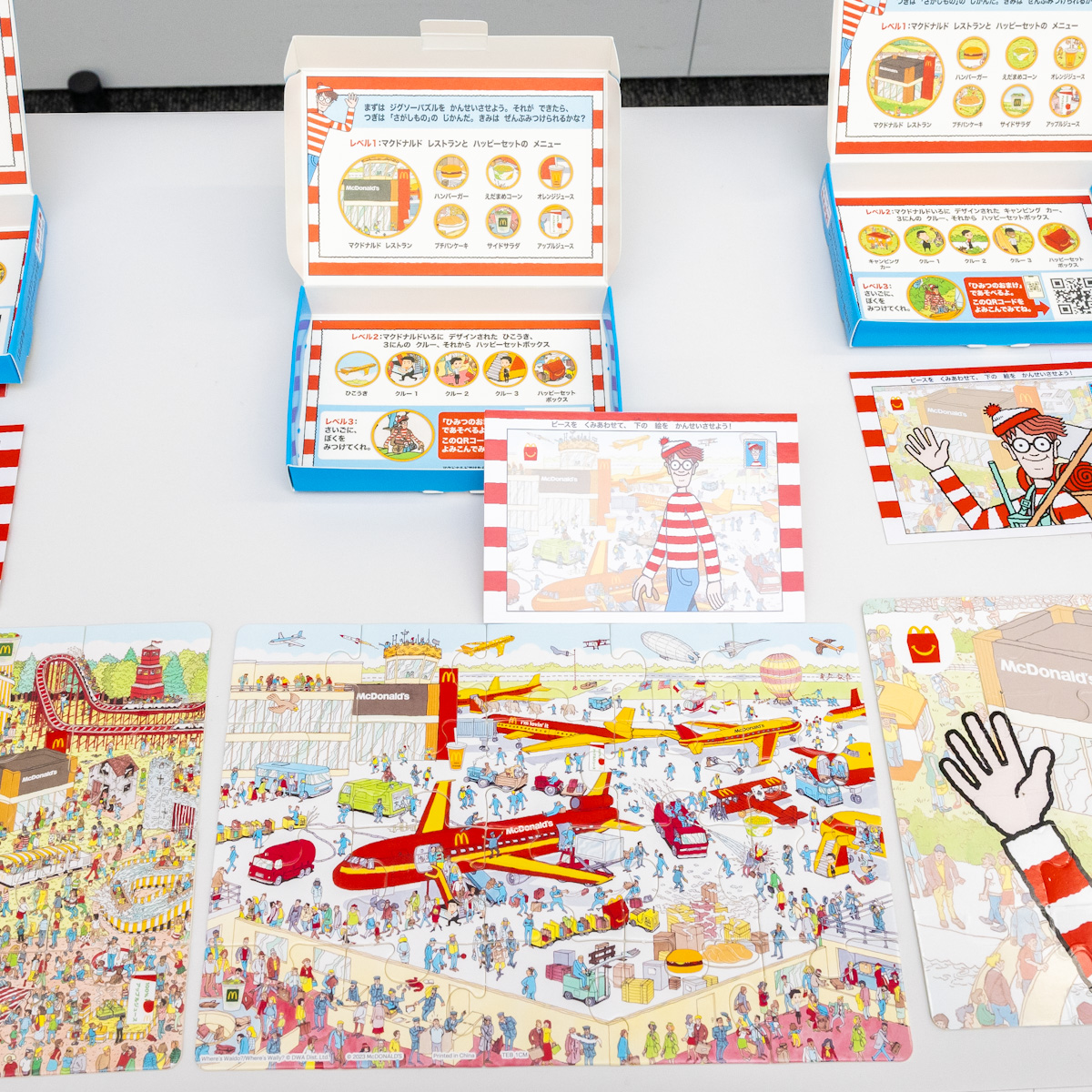 ハッピーセット「ウォーリーをさがせ!」第1弾は「遊園地」「空港」「キャンプ場」のオリジナルデザインのパズルが登場。