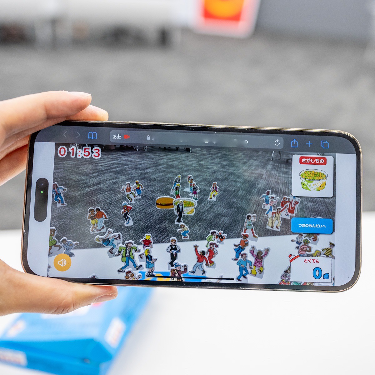 ハッピーセット「ウォーリーをさがせ!」のおもちゃの箱のQRコードにスマートフォンをかざすと、ARでウォーリーが飛び出します。