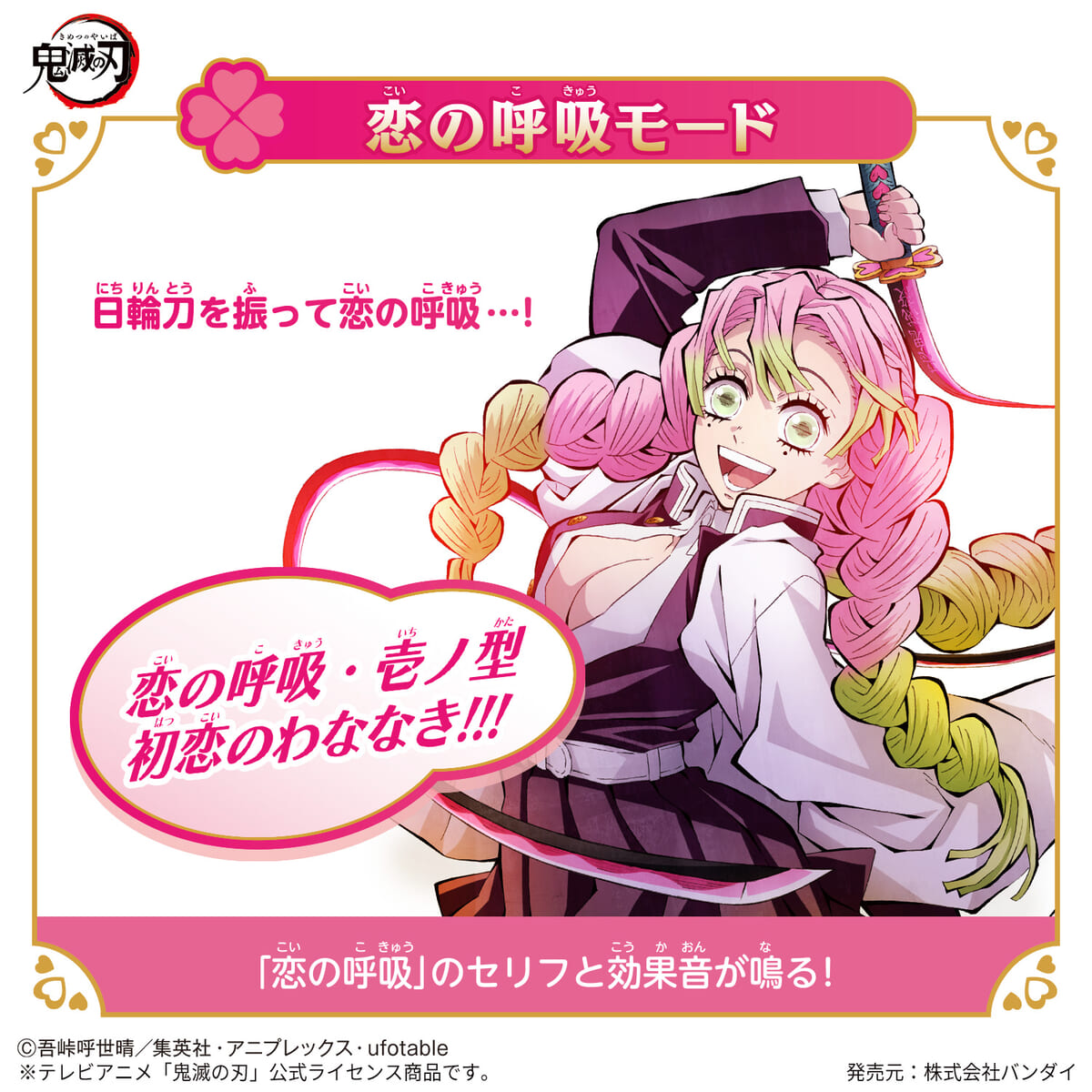 セリフが流れた後に日輪刀を振ることで効果音が発動、甘露寺蜜璃になりきって遊ぶことが可能。