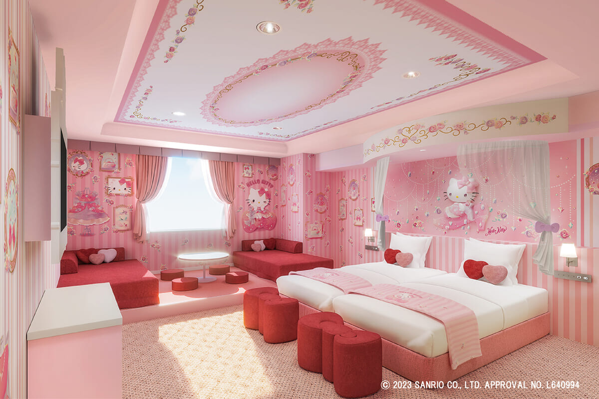 「ハローキティ」と「マイメロディ&クロミ」をテーマにした、ラグジュアリーな客室。