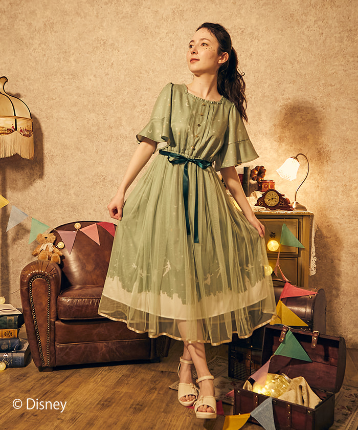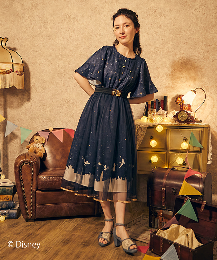 「ピーター・パン」を先頭に「ティンカー・ベル」「ウェンディ」「ジョン」「マイケル」がロンドンの空を飛んでいくシーンを柄に落とし込んだワンピース。