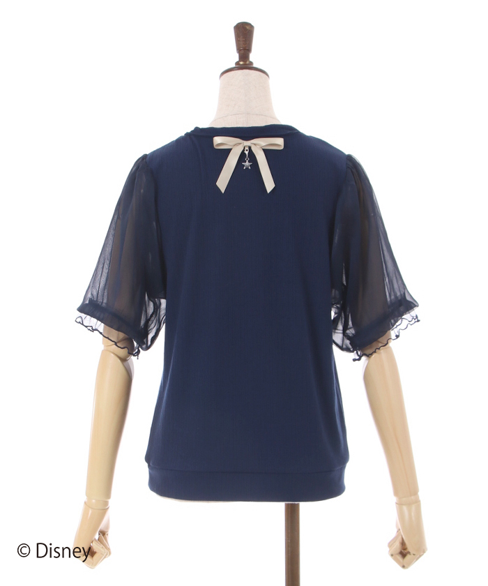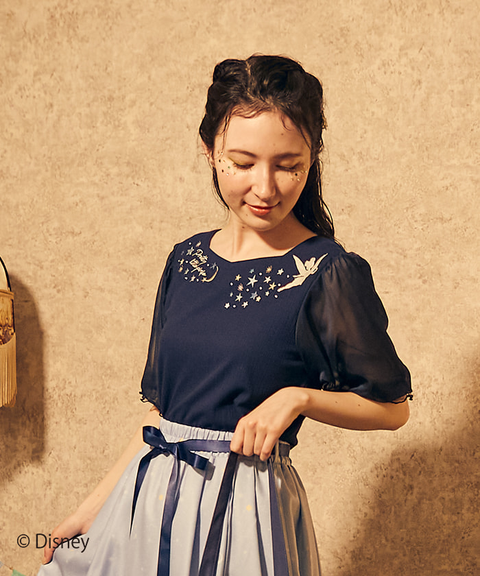 ティンカー・ベルがキラキラと軌跡を残して楽しく飛んでいる姿を刺繍したトップスです。