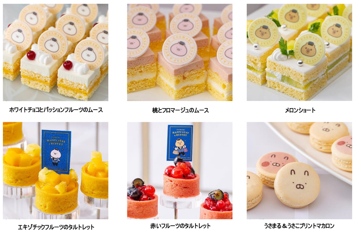 デザートメニュー ホワイトチョコとパッションフルーツのムース、桃とフロマージュのムース、メロンショート、エキゾチックフルーツのタルトレット、赤いフルーツのタルトレット、うさまる&うさこプリントマカロン、シャルロットフリュィ、ヴェリーヌキウイ、ヴェリーヌピーチ、柑橘のミニバスケット、チェリーカップケーキ