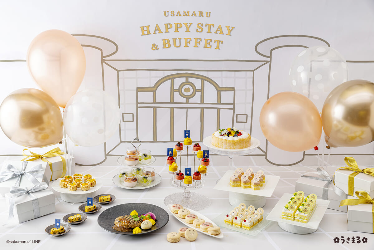 ホテリエ姿の「うさまる」たちが登場するビュッフェやオリジナルグッズ、大きなぬいぐるみが迎えてくれるコラボレーションルームも。
