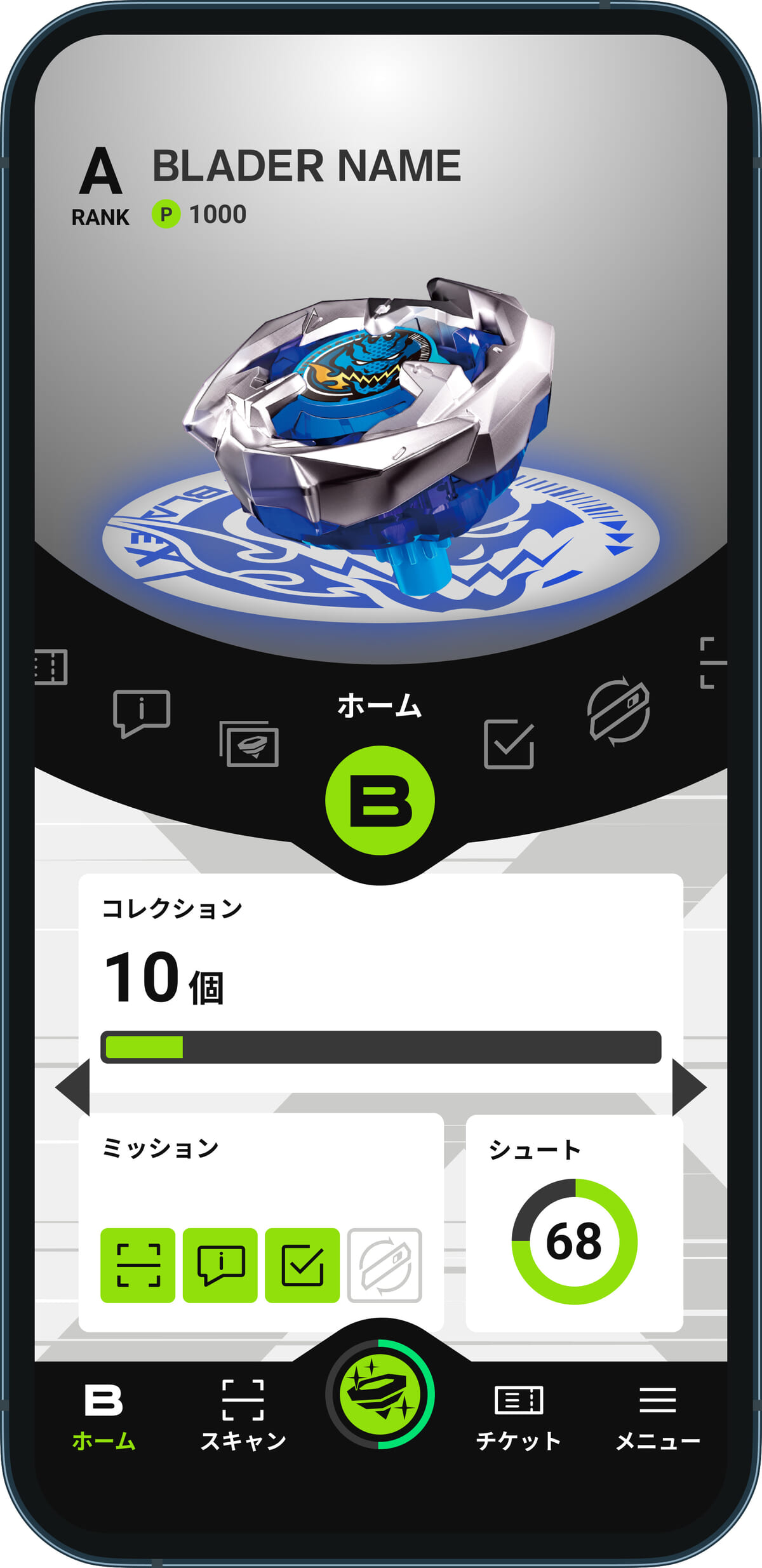 連動する専用デバイス「ベイバトルパス」で計測したシュートパワーやシュート回数を表示してポイント化できる他、ベイバトルパスのシュートパワーを使ったデジタルベイバトルやイベント参加などベイブレードの様々な活動を通してポイントが貯まります。