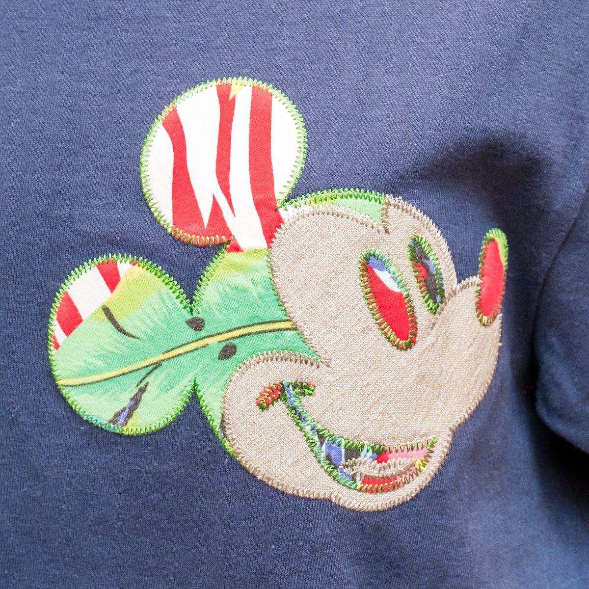 ポリネシアンテラス・レストランの使い終わったコスチュームの生地をミッキーマウスのアップリケに使用することで、東京ディズニーリゾートらしい商品が誕生。