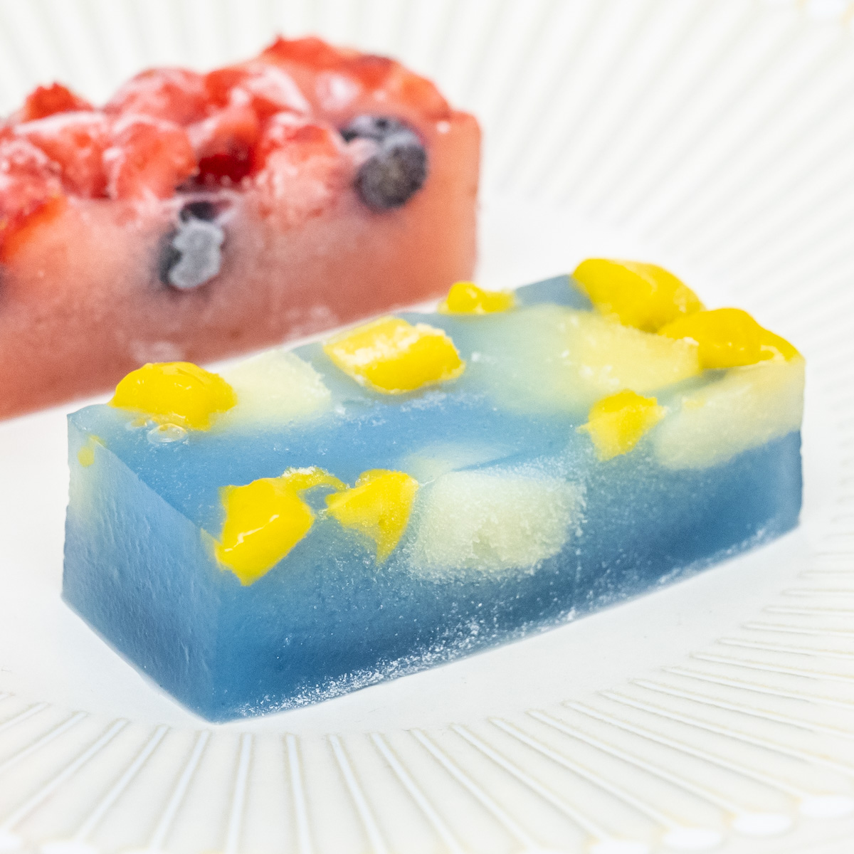 ソーダ風味の葛アイスに、パインとマンゴーをトッピング。