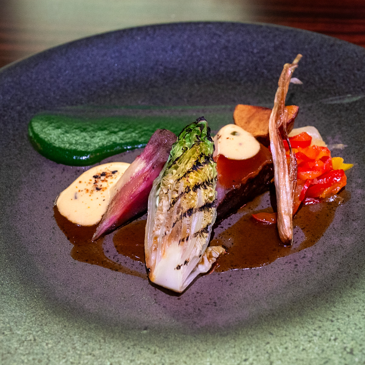 • 和牛サーロインとリトルジェムレタスのグリル 青唐辛子味噌のベアルネーズソース