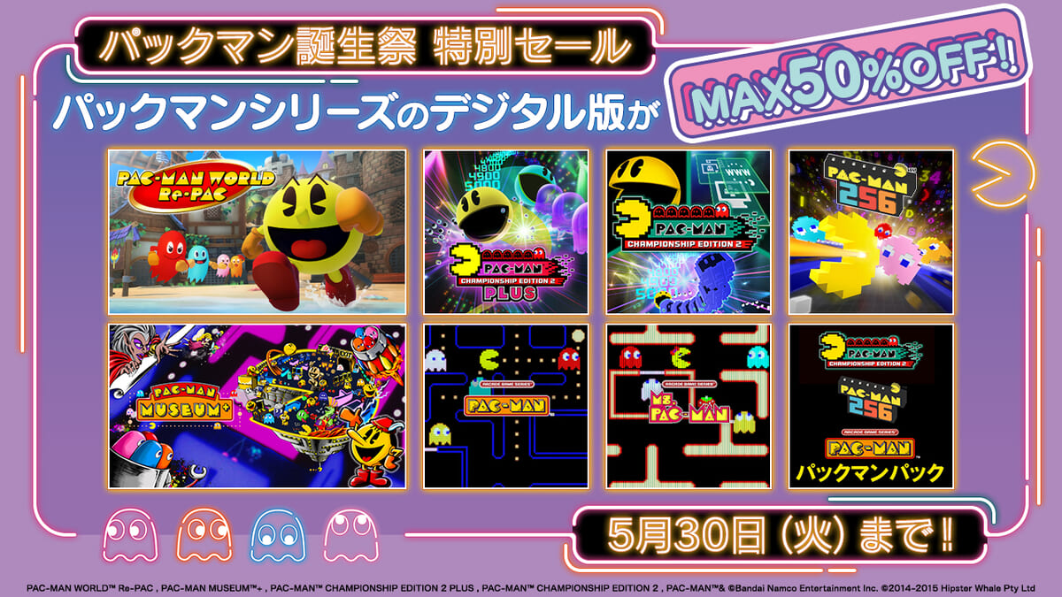 「パックマン」のお誕生日を記念して、最新作『パックマンワールド リ・パック』を含む家庭用ゲームのダウンロード版が、最大50%オフで販売中。