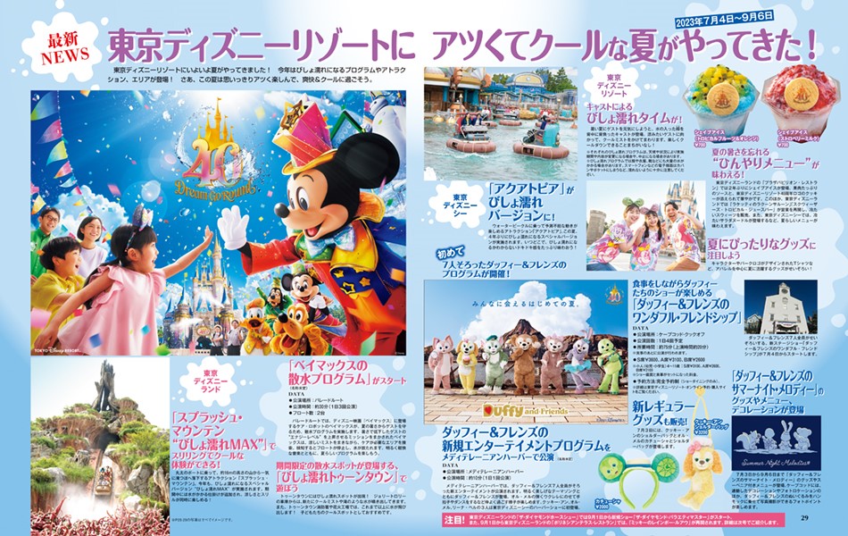 東京ディズニーリゾート40周年”ドリームゴーラウンド”の楽しみ方や、夏のびしょ濡れ散水プログラムの情報が盛りだくさんの一冊。