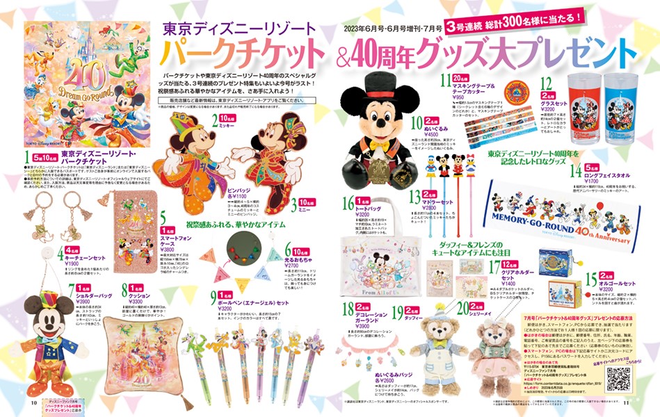 「ディズニーファン」2023年7月号では、スペシャル企画として「東京ディズニーリゾート パークチケット&40周年グッズ大プレゼント」を開催。
