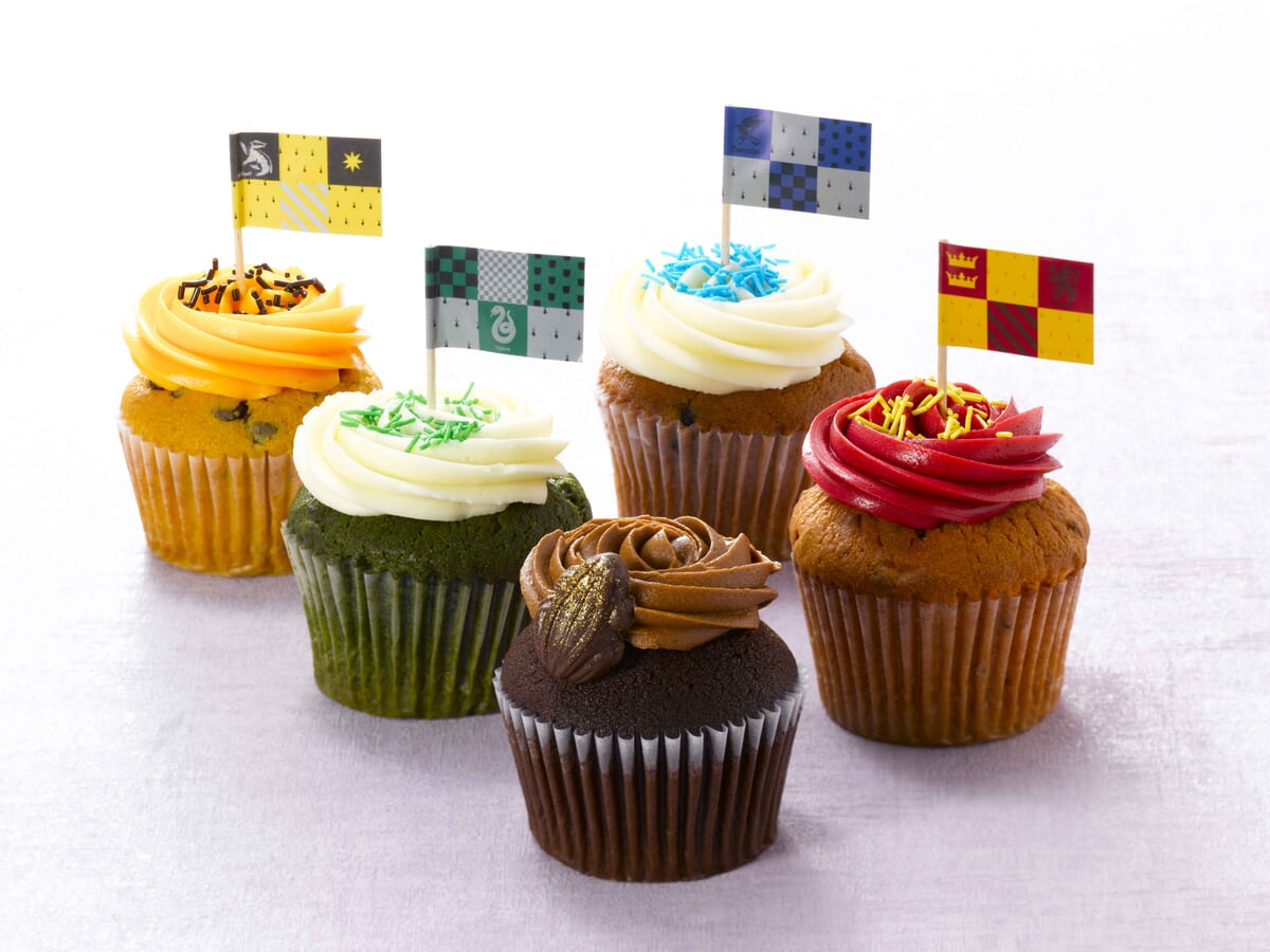 「グリフィンドール」「ハッフルパフ」「レイブンクロー」「スリザリン」をモチーフにしたカップケーキにはミニフラッグが付いています。