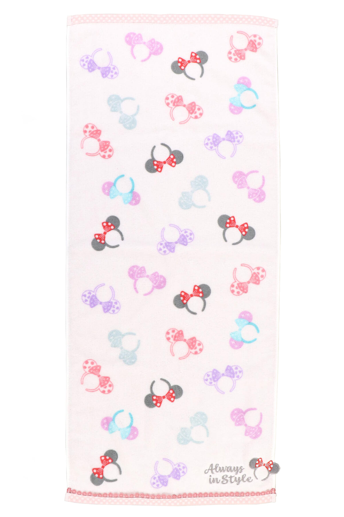 リボン付きのカチューシャが散りばめられた、総柄デザインのフェイスタオル。