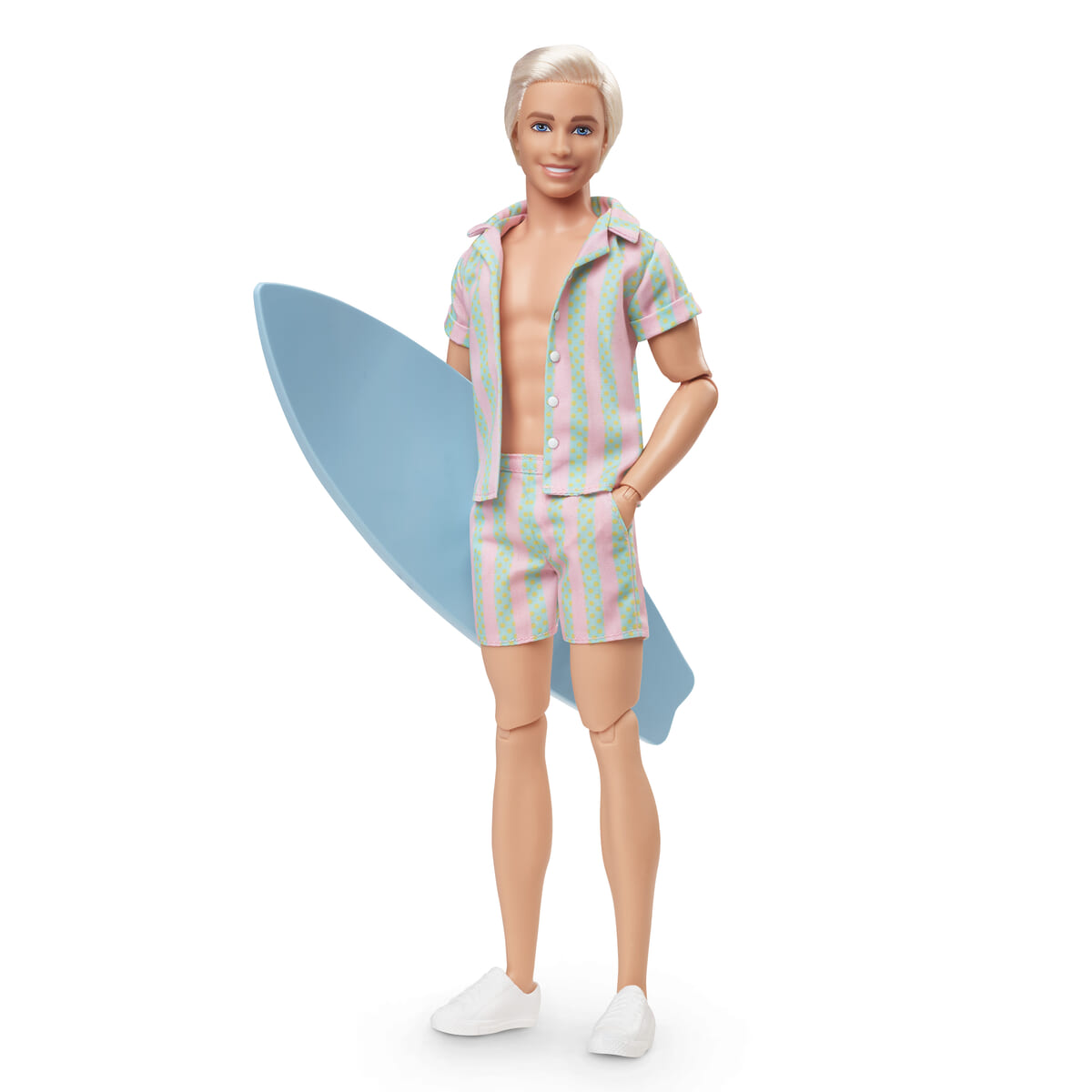 着せ替えやポージングがしやすい、サーフボードを持ったさわやかなケンのドールです。