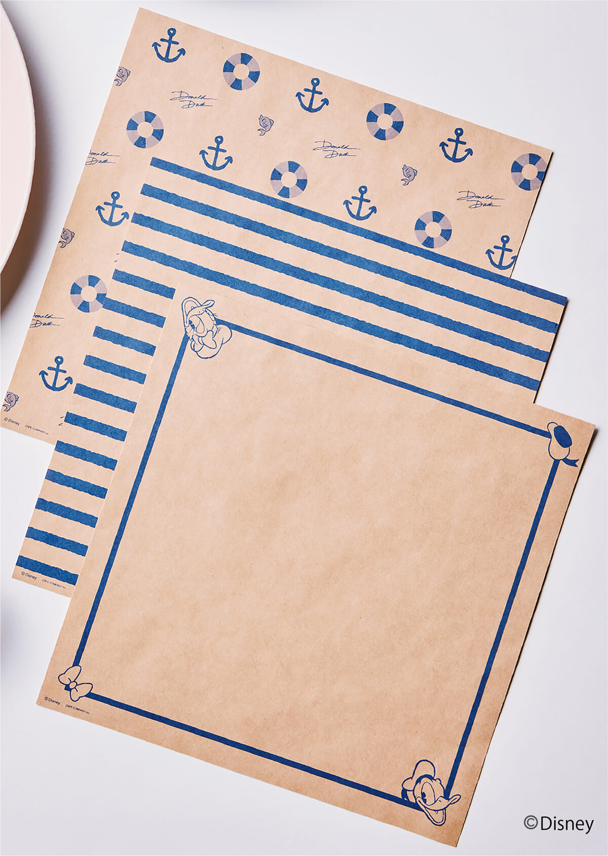 浮き輪や錨など一面に並んだモチーフが配されたペーパーや、青いボーダー柄のラッピングペーパーも入っています。