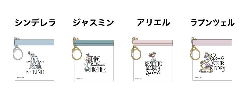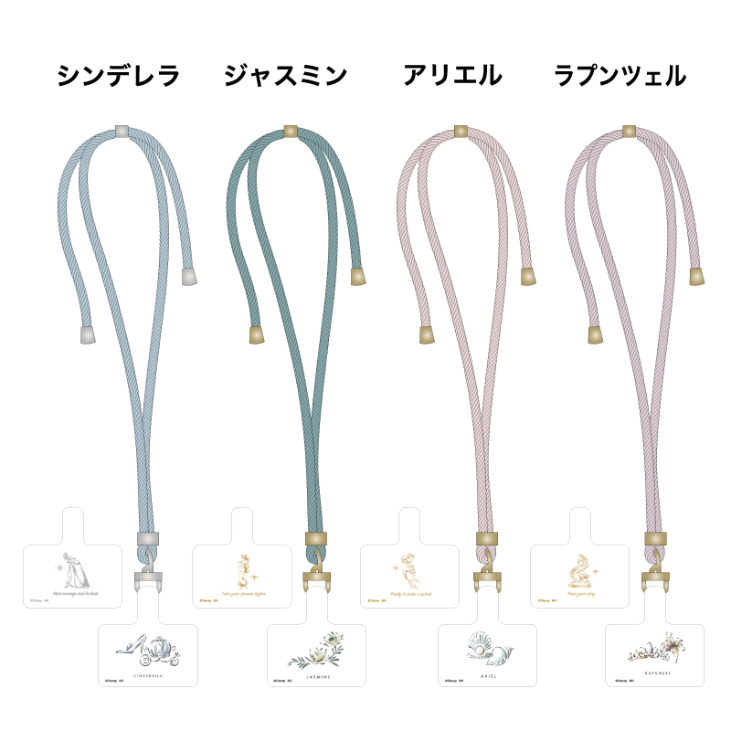 「シンデレラ」「ジャスミン」「アリエル」「ラプンツェル」のスマホストラップとミニポーチがラインナップ。
