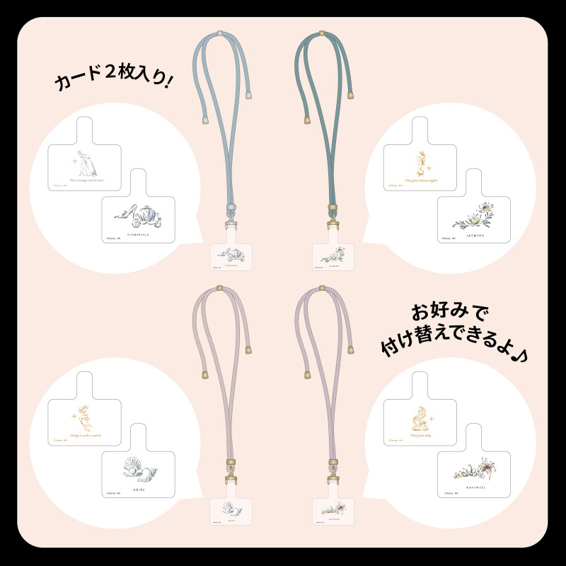 ディズニープリンセスと作中に登場するモチーフが描かれた、2つのカードが付いたスマホストラップ。