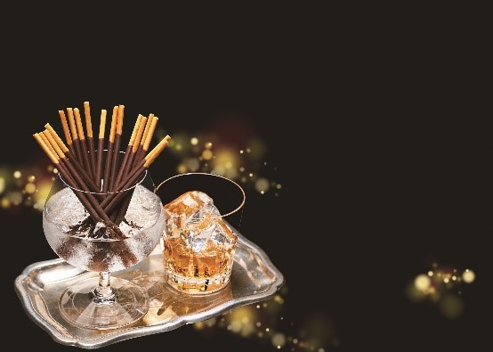 「ポッキー・オン・ザ・ロック」とは、氷を入れたグラスにポッキーを入れたり、ポッキーをドリンクのマドラー代わりにしたりして楽しむ食べ方。