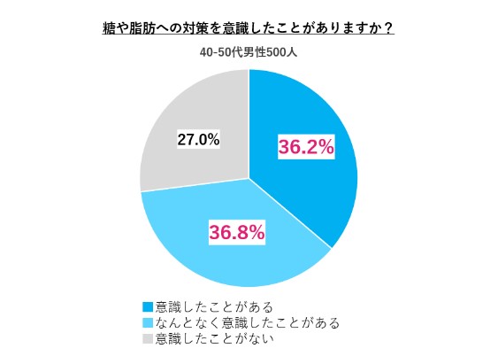 また、「糖と脂肪に関する調査」によると、40~50代男性のうち7割以上が「糖や脂肪への対策について意識したことがある」と回答。
