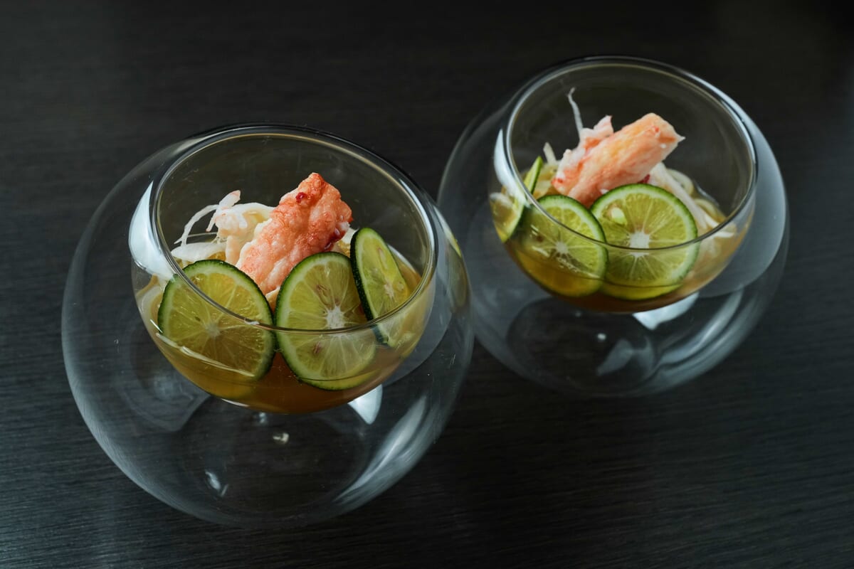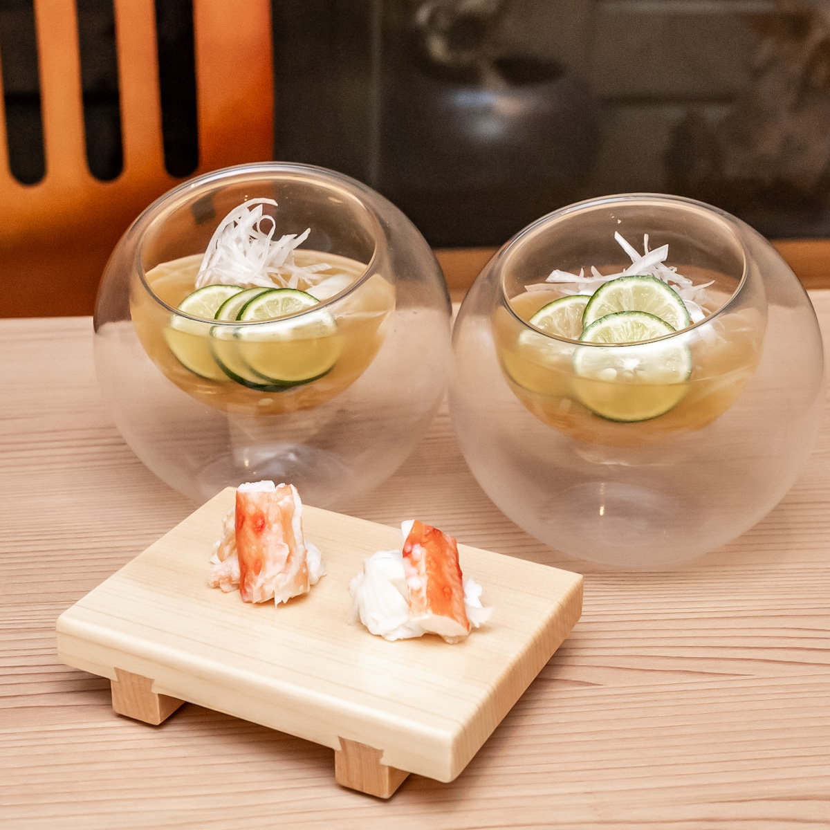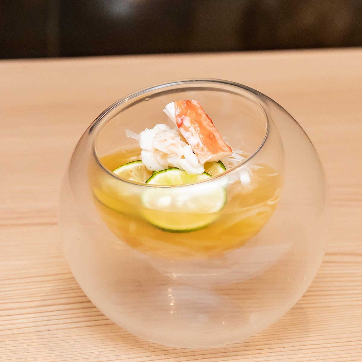 人気メニューの「一口冷麺」にタラバガニをトッピングした、甘やかしコース特別メニュー。