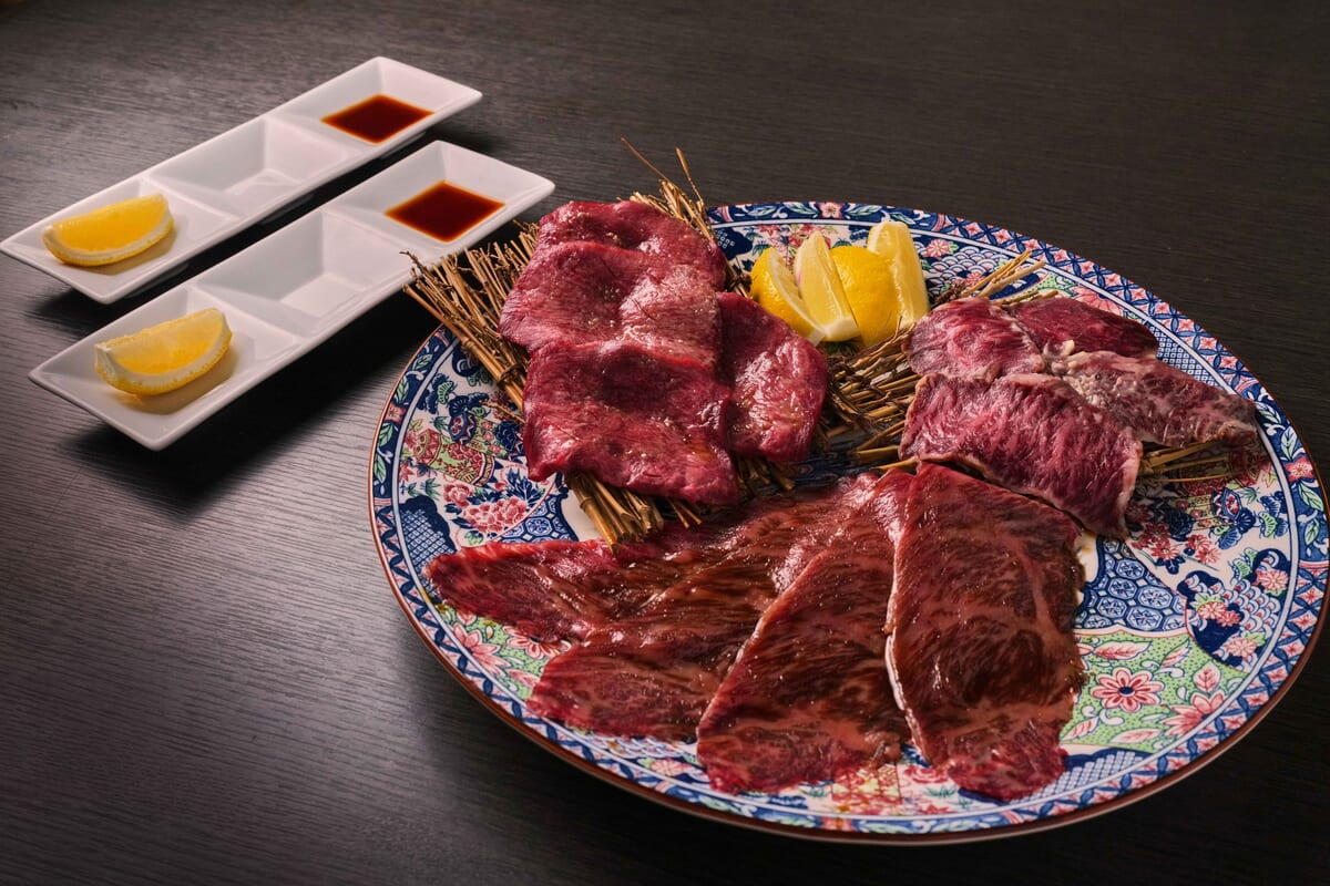 「富士門」のオススメの、「上タン塩」「特上ハラミ~西京味噌と塩麹、酒粕~」「和牛イチボ 自家製タレ」の3種の焼き物の盛り合わせ。