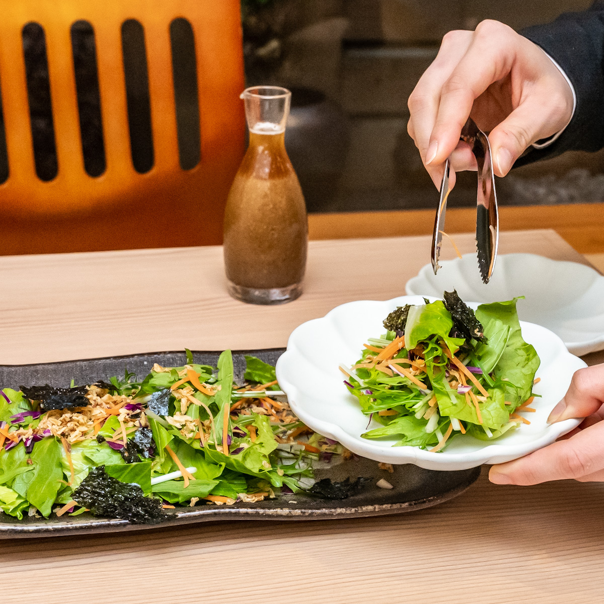 目の前でドレッシングをかけ、取り分けまでしてくれる甘やかしサービス付きです。
