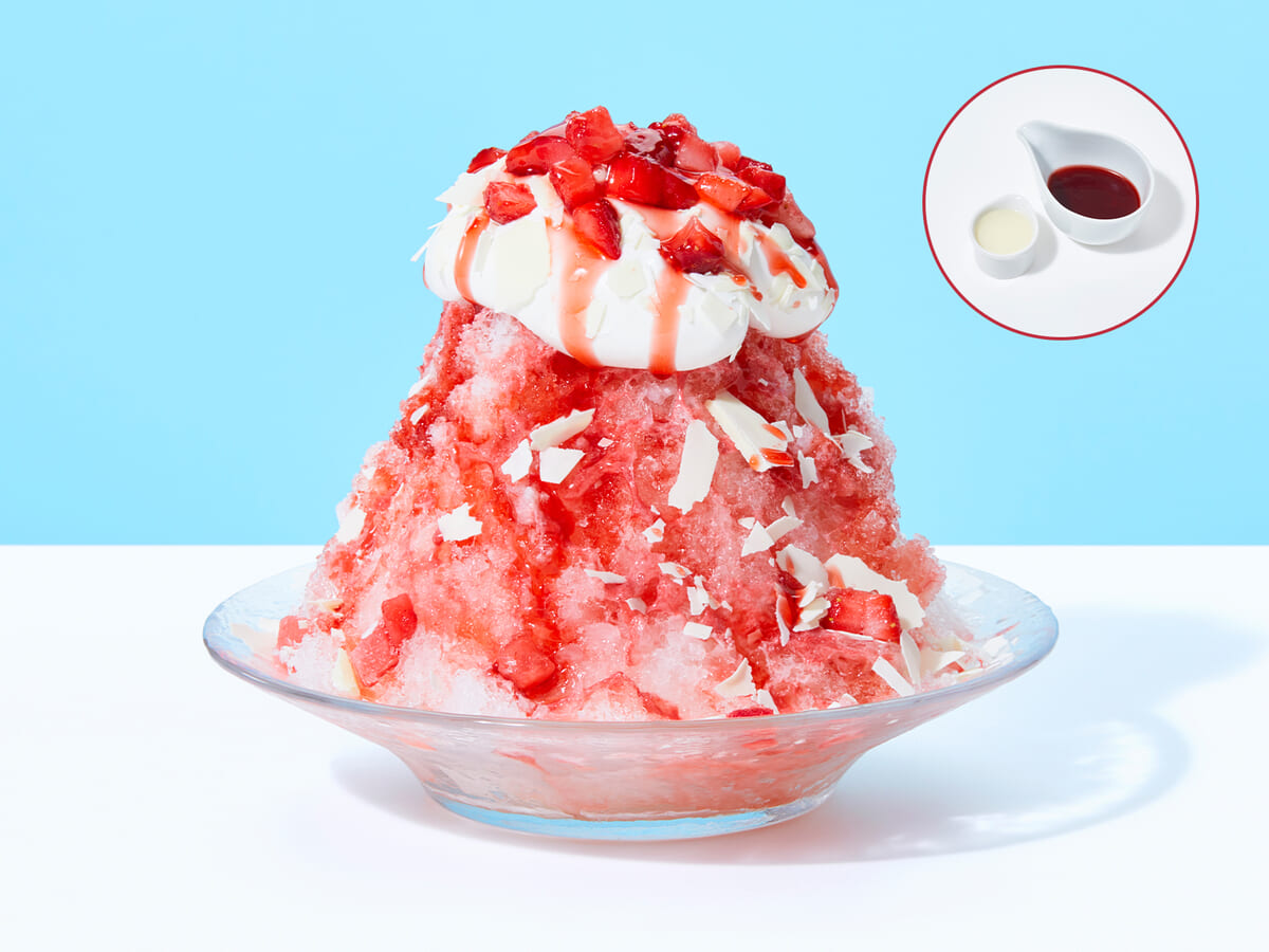 ふわふわの純氷にふわとろホイップとフローズンストロベリー、ホワイトチョコフレークをトッピングしています。