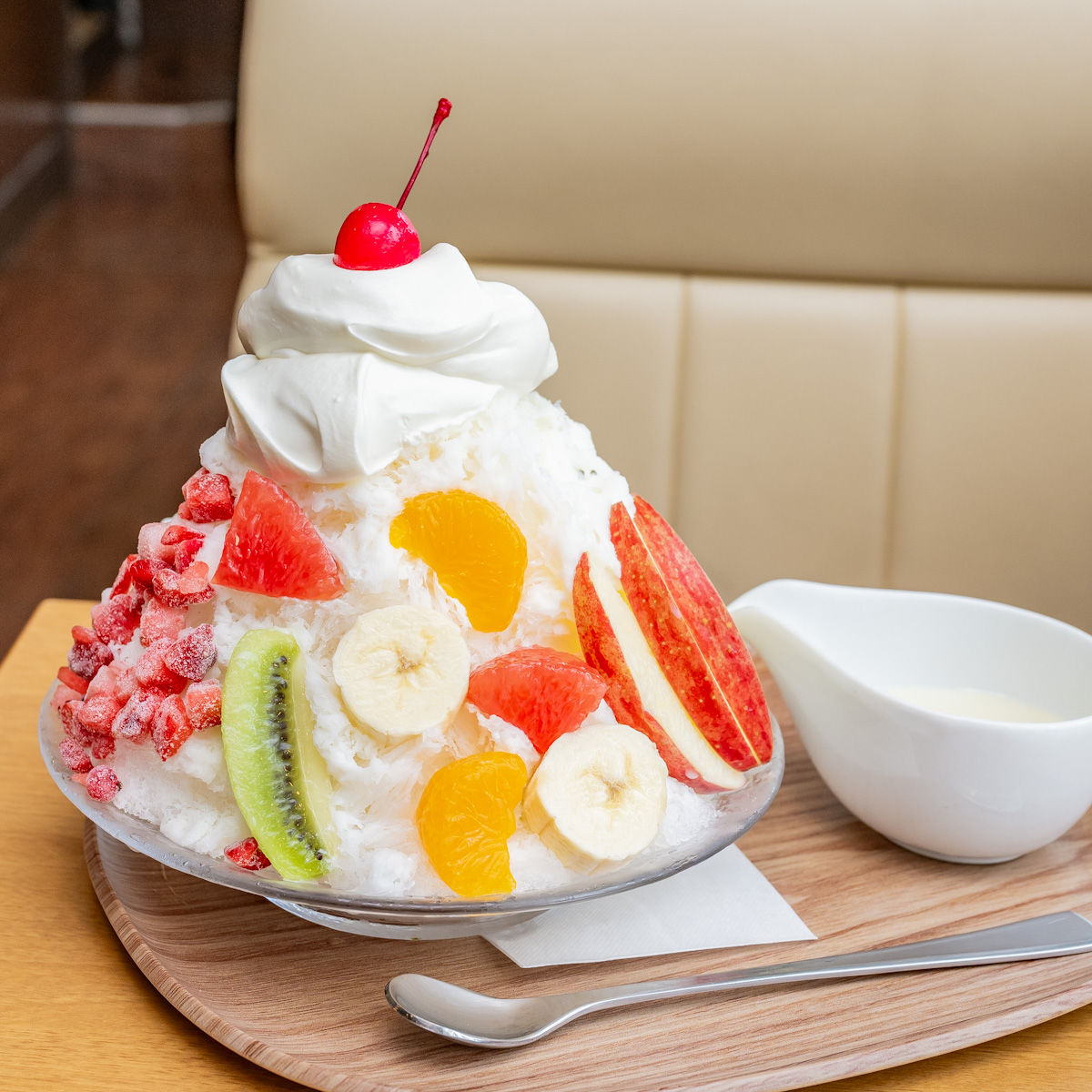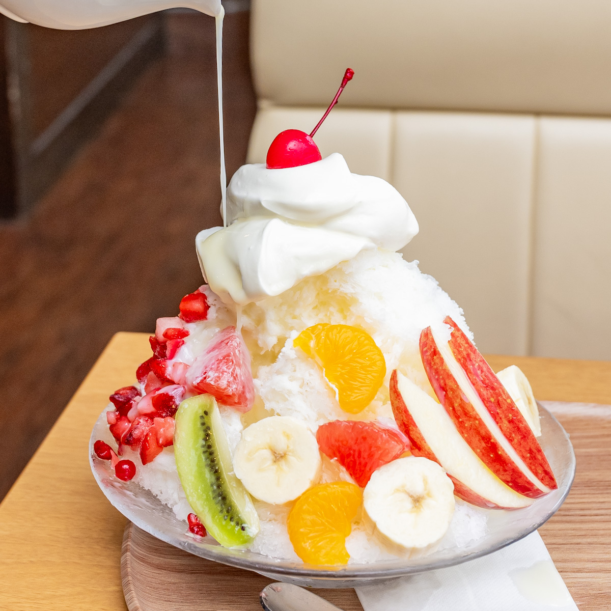 ふわふわの純氷の表面に、キウイ、バナナ、ピンクグレープフルーツ、りんごなどたっぷりのフレッシュフルーツをトッピングした、満足感たっぷりの一品です。