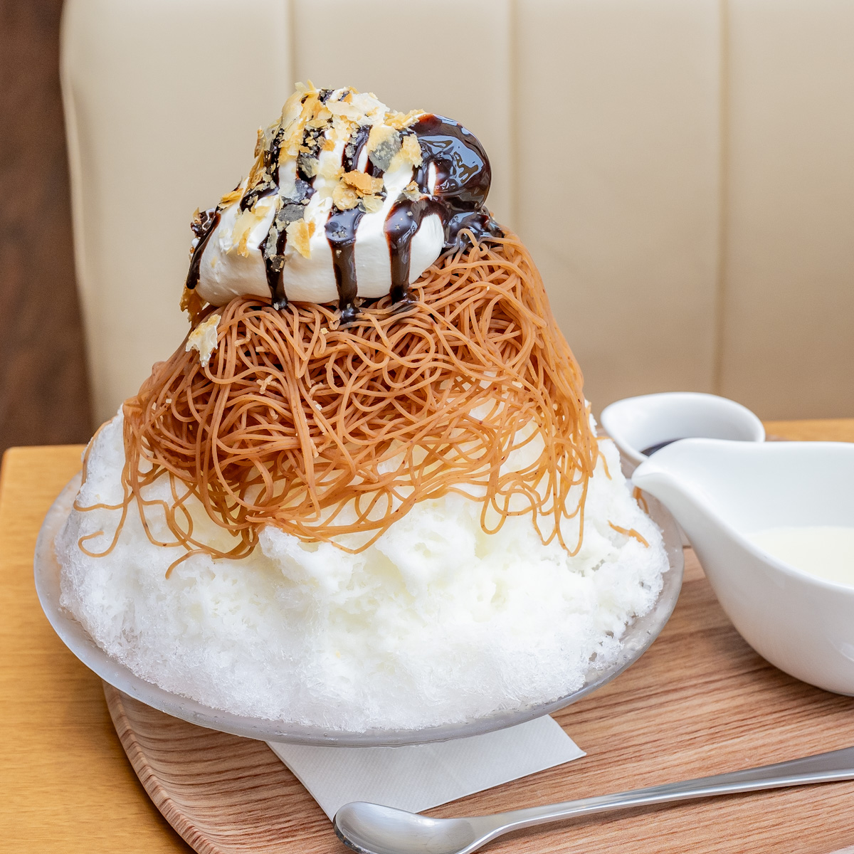 ふわふわの純氷にしっとりなめらかなイタリア産マロンのペーストとチョコソース、サクサクのクラッシュパイを組み合わせた、まるでスイーツのような食べ応えのかき氷です。