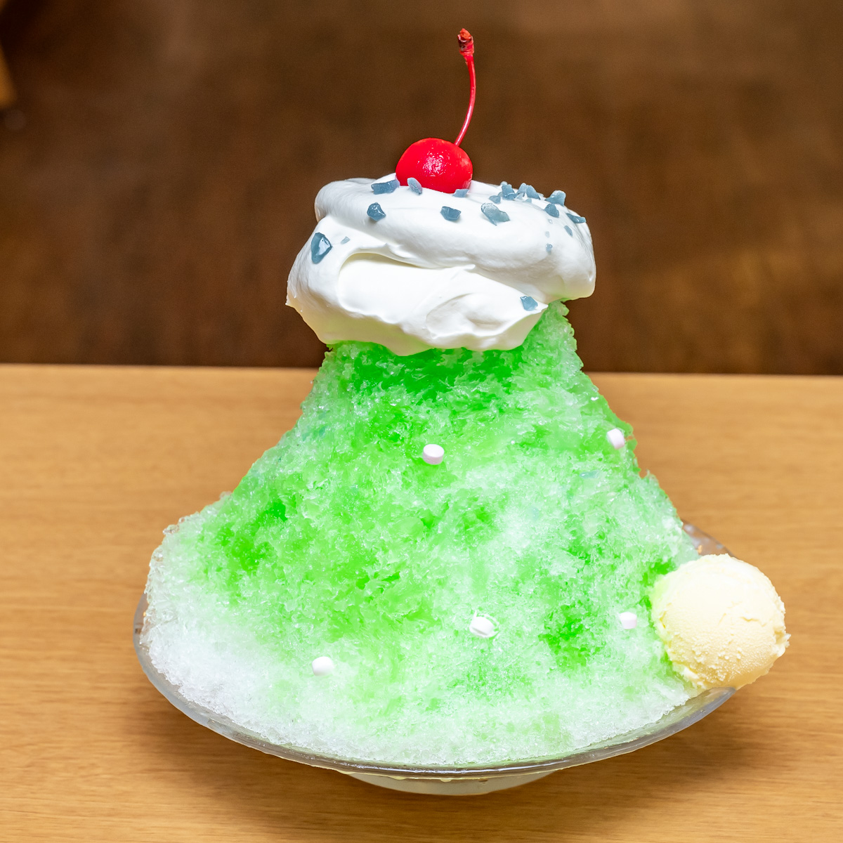 鮮やかな緑色のメロンシロップをかけた純氷に、ふわとろホイップとさくらんぼのシロップ漬け、バニラアイスが添えられています。
