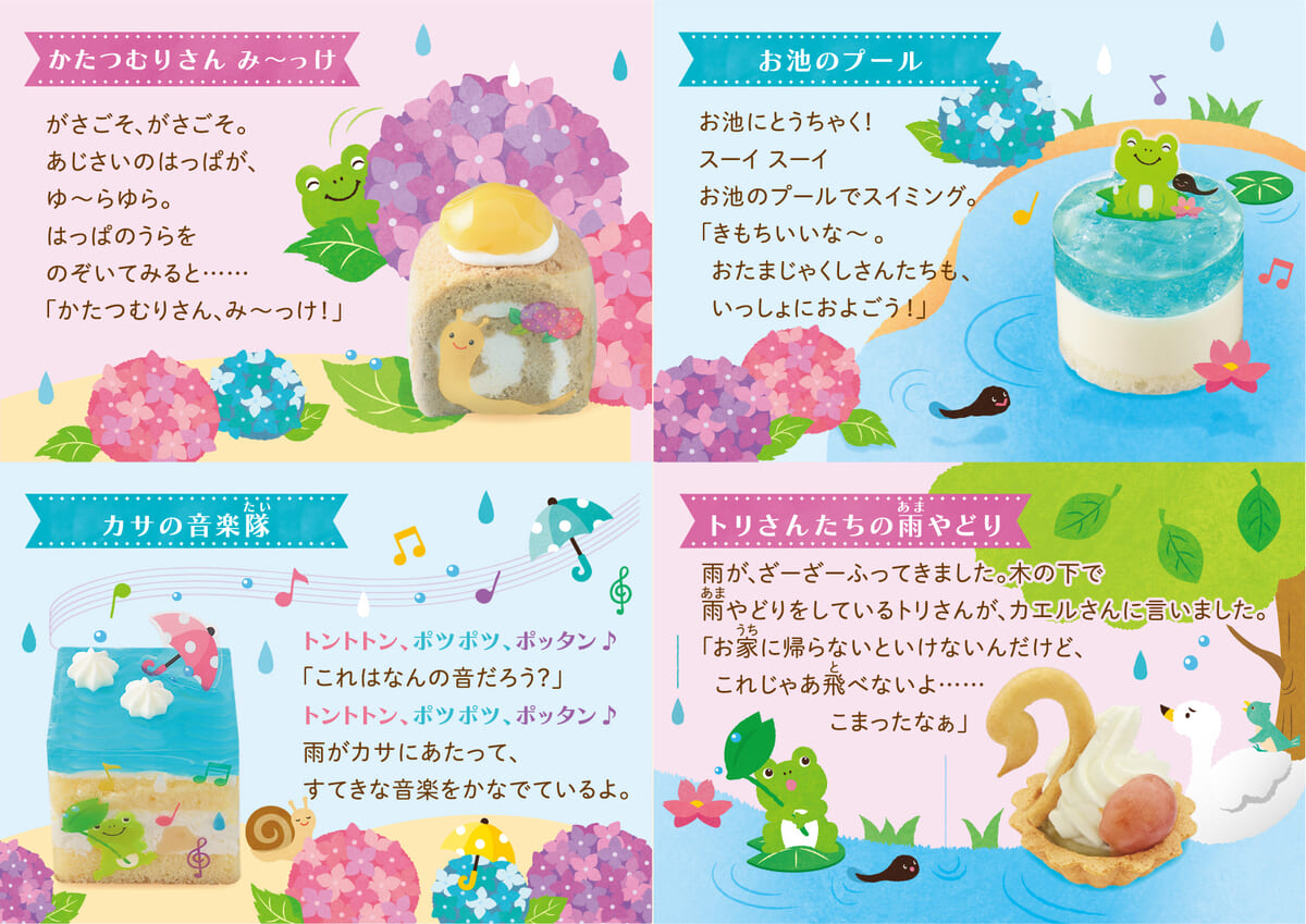 カエルさんが楽しく散歩する様子を9つのプチケーキで表現した、絵本風スイーツ第2弾。