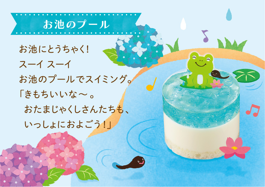 カエルさんが楽しく散歩する様子を、季節のフルーツを取り入れた9つのプチケーキで表現。