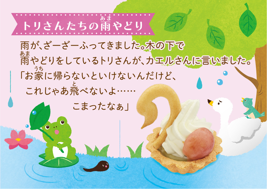 カサに当たる雨の音に耳をすませたり、雨やどりしているトリさんたちに出会ったり、お散歩を楽しみます。