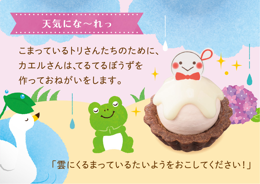 こまっているトリさんたちのために、カエルさんは、てるてるぼうずを作っておねがいをします。
