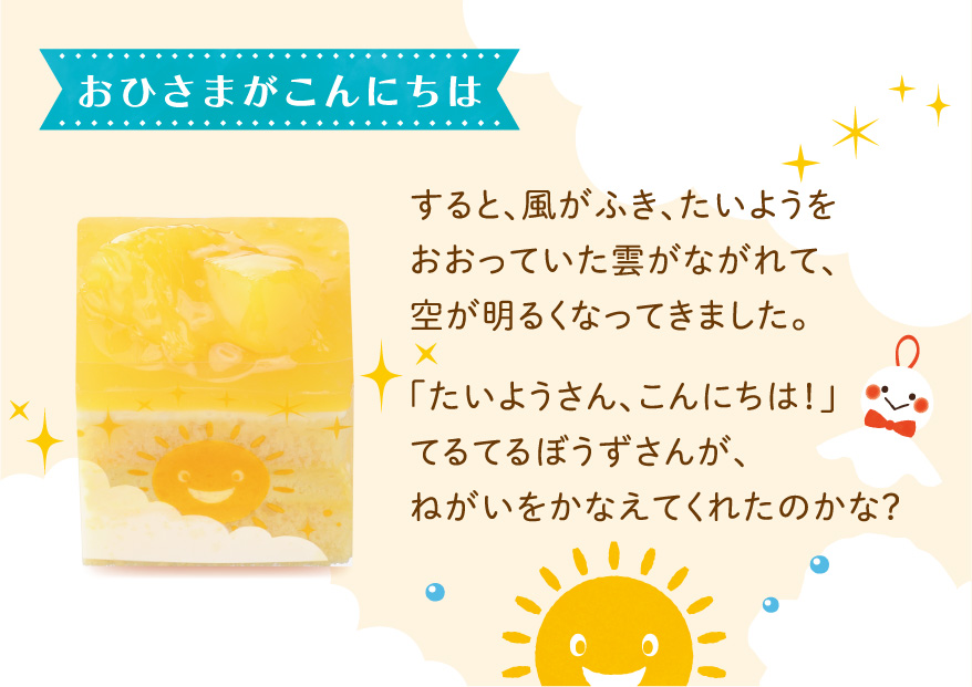 「たいようさん、こんにちは!」てるてるぼうずさんが、ねがいをかなえてくれたのかな?