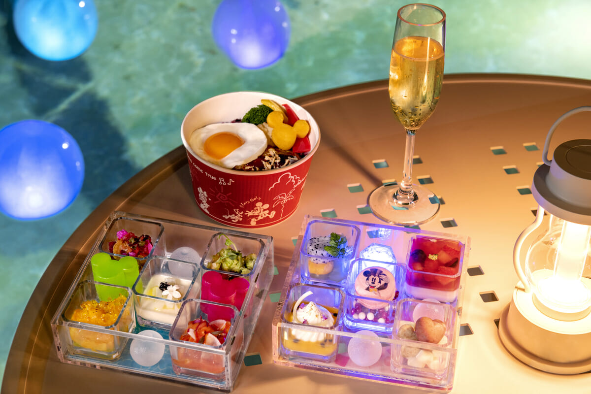 アペタイザーや、ロコモコ丼、デザートを幻想的なナイトプールのそばでいただけるプラン。