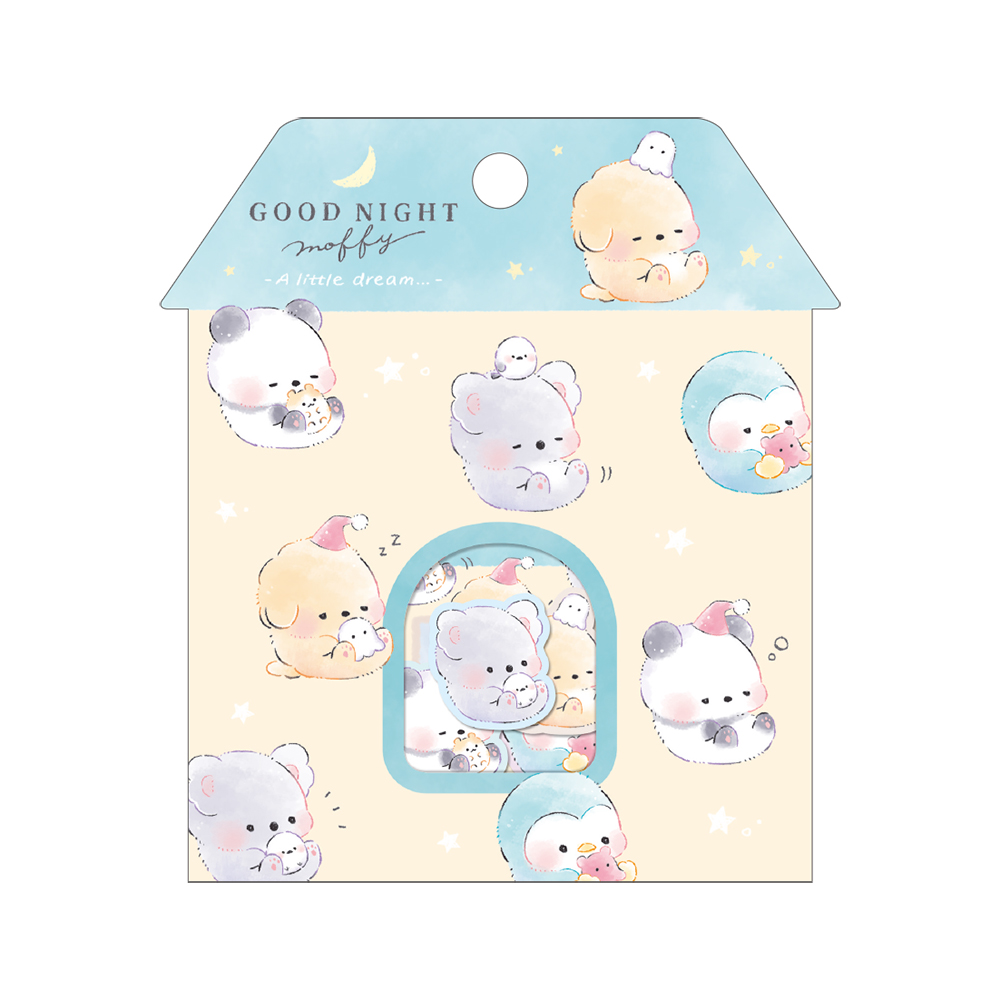 パンダやコアラ、ペンギンたちが眠そうな表情を浮かべてお座りしているシールフレーク「すやすやモフィ」