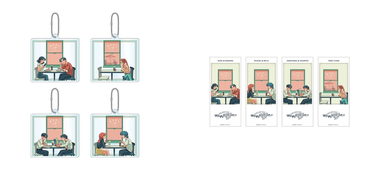 カフェでのひとときを過ごす、登場人物たちを描いたアクリルキーホルダーとステッカー。