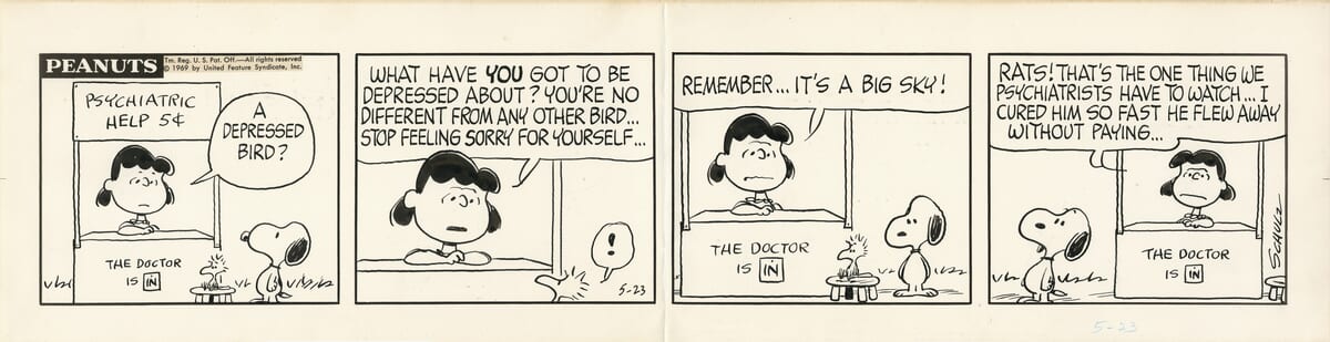 「ウッドストック」の悩みを素早く解決した「ルーシー」だけれども、支払いはもらい忘れてしまう。
